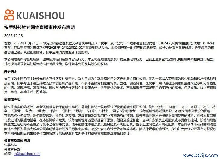 12月23日,快手发布声明称,快手哄骗的直播功能于2025年12月22日22:00傍边遭到鸠合报复,本公司已第一技巧脱手救急预案,经全力处理与系统开拓,快手哄骗的直播功能已渐渐还原正便处事。快手哄骗的其他处事未受影响。
